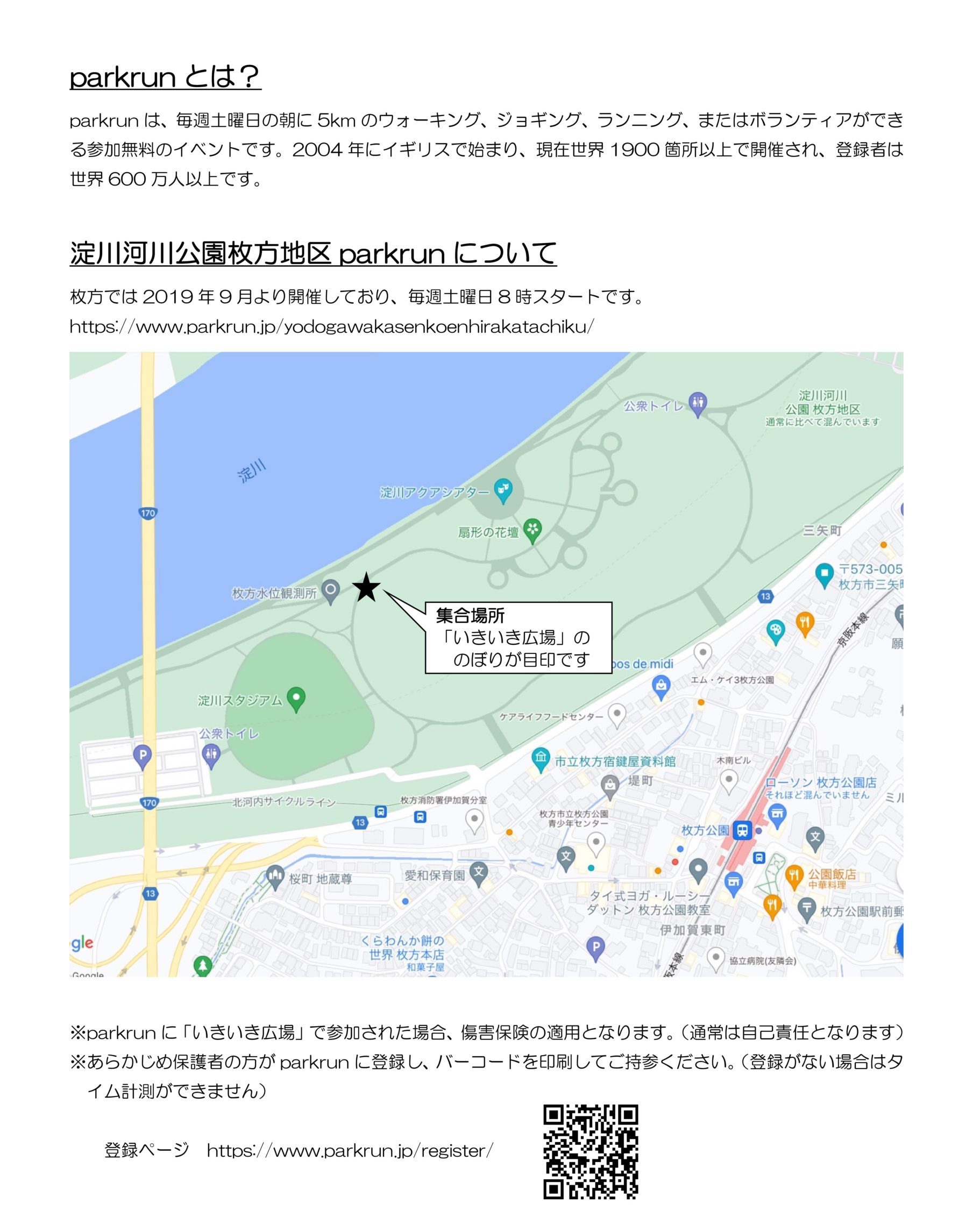 淀川河川公園枚方地区 parkrun 8時00分~9時15分 場所:淀川河川敷 締切:10/15 毎週土曜日に開催されている「淀川河川公園枚方地区 parlrun」に「枚二いきいき広場」で参加します。 ※このイベントに参加するには保護者の同伴が必要です。 ※タイムを計測するには参加登録が必要です。(右ページ参照・登録がない場合は計測されません) |